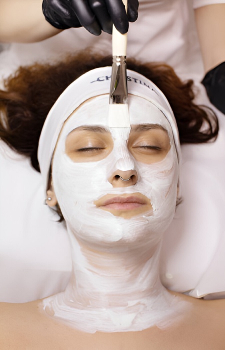 Skin on face and neck is gently washed using a brightening cleanser to remove dirt and prepare for treatment.